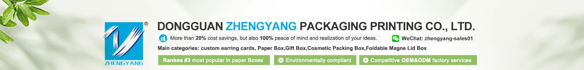 Dongguan Zhengyang Packaging Printing Co., Ltd. Founded in 2006, an integrated manufacturing & trading enterprise with 19-year packaging printing expertise. We specialize in high-end custom packaging /jewelry packaging/gift boxes/corrugated color boxes/hang tags & stickers. , serving premium clients in Europe, America, Australia, Canada, Japan, etc. Core Strengths ★- Certifications: ISO 9001, ROHS(CE), SMETA, FSC, Disney Supplier Certification ★- Efficiency: Avg. 15-day delivery (industry: 25-30 days), samples in 72hrs ★- Quality: 0.3% defect rate (industry: 1.5%-2.5%) ★- Cost: Cut clients’ comprehensive costs by over 20% ★- Partnerships: Long-term coop with global brands like Decathlon, Disney